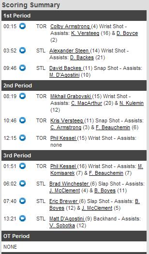 Conforme o quadro ao lado, o Toronto começou assustando, com Phil Kessel perdendo sua tentativa. na sequência, Alexander Steen colocaria os Blues em vantagem.