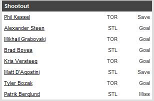 O próximo a marcar foi Kris Versteeg, pelos Leafs. Matt D’agostini, que marcou o gol de empate dos Blues, viu sua tentativa, que se convertida, daria a vitória nos pênaltis para os Blues, ser defendida por Gustavsson.