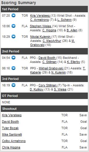Toronto começou na frente – fato que não ocorria há dez jogos – com um gol de Kris Versteeg aos 7:20 do primeiro período. A resposta dos Panthers veio onze minutos depois, com Stephen Weiss. Mas, após menos de trinta segundos, os Leafs voltam a liderar com um gol de Nikolai Kulemin, que, com seu décimo-sétimo gol, passou sua marca de gols na temporada.