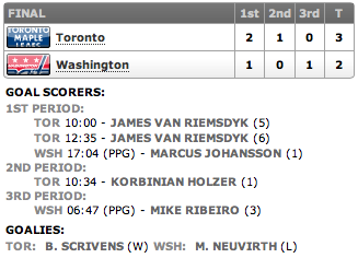 Ao final da partida, os Leafs venceram por 3 x 2, na segunda vitória sobre os Capitals nesta temporada, ambas pelo mesmo placar.