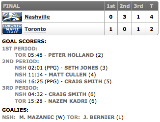 Logo aos 04m32s do terceiro período, Craig Smith marcou seu segundo gol da noite, tornando uma reação dos Leafs ainda mais difícil. Os Leafs melhoraram, mas acabaram parados pelo goleiro dos Predators, Marek Mazanec. Somente aos 15m28s Nazem Kadri conseguiu vencer Mazanec, mas já era tarde demais e, mesmo com os Leafs sem goleiro, em Empty Net, não houve mais gols na partida, nem mesmo dos Predators que, por algumas vezes, chutaram no gol vazio, e erraram!