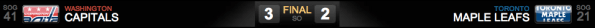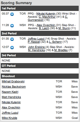 Após uma prorrogação sem gols, as equipes foram para os pênaltis (shootout). Nazem Kadri foi o primeiro e teve seu chute salvo por Neuvirth. Ovechkin foi o primeiro dos Caps e Gustavsson fechou a porta para ele defendendo seu chute. Na segunda rodada, Grabovsky marcou para os Leafs com um gol onde ele dá uma volta de 360º no estilo de Jason Blake enquanto Gustavsson defendeu a tentativa de Mathieu Perreault. Os Leafs estavam à frente e na terceira rodada, Kessel, que poderia garantir a vitória, acabou chutando para fora, deixando para Alexander Semin decidir se haveria uma rodada adicional, ou se a vitória seria dos Leafs e Jonas Gustavsson, mais uma vez, defendeu o chute, garantindo a vitória aos Leafs!