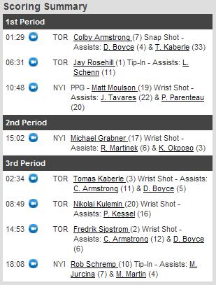 Koskinen iniciou a partida e aos 1m29s, Colby Armstrong abre o placar para os Leafs no primeiro chute à gol. O segundo chute à gol dos Leafs foi de Luke Scheen e foi desviado por Daryl Boyce, aos 06m31s e entrou por sobre o ombro de Koskinen. O goleiro novato dos islanders tomou 2 gol em 2 chutes à gol, e o time não tinha o que fazer, pois não havia outro goleiro para substituí-lo.