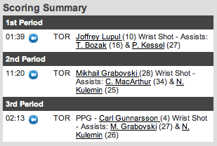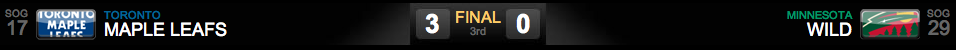 Os Leafs conseguiram um shutout, vitória onde o time adversário não consegue marcar gols, por 3 a 0, com gols de Joffrey Lupul, Mikhail Grabovski e Carl Gunnarsson, apesar do limitado número de chutes à gol!