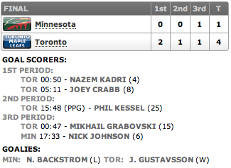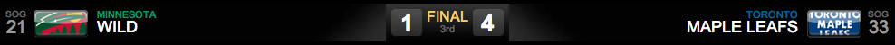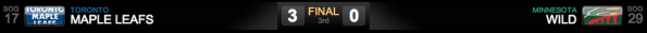 Já no finalzinho da partida, com os WIld buscando um gol para se aproximarem dos Leafs no placar, Kessel rouba o puck e Mason Raymond parte em velocidade, mas aparentemente não toca no puck, deixando o mesmo deslizar para o gol vazio. Na minha visão e opinião, e inclusive na opinião de Joe Bowen, narrador dos Leafs, o gol foi de Kessel, mas a NHL está reportando como gol de Mason Raymond. O importante é que sendo de Raymond ou de Kessel, a vitória é dos Leafs, por 4 a 1.