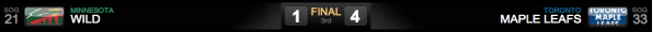 No último período os Leafs marcaram o quarto gol com Mikhail Grabovski logo aos 47s. Os Leafs dominavam a partida e os Wild acordaram somente nos 5 minutos finais, quando começaram a ameaçar mais o gol de Gustavsson. Aos 17m33s, Nick Johnson marca o gol de honra dos Wild, num chute de um ângulo muito fechado que entrou por debaixo das proteções de perna de Gustavsson, que redirecionou o puck para o gol, entrando apenas alguns centímetros da linha de gol dos Leafs.