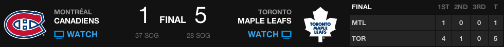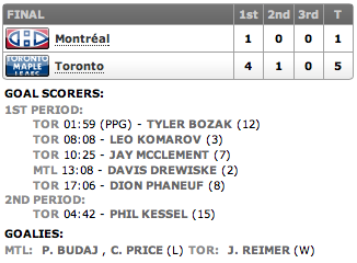 Neste jogo os Leafs foram apáticos, os Habs souberam dominar o gelo, não permitindo aos Leafs ganhar o puck ou chegar ao ataque com mais liberdade, tanto que o número de chutes a gol dos Habs foi de 40, enquanto os Leafs chutaram 23 vezes ao gol de Carey Price. A defesa nao conseguia limpar o puck e oferecer boa cobertura para Scrivens. Phil Kessel não apareceu na partida e o time errou muito, não só no último período, mas na partida toda. Scrivens não vem jogando de forma tão sólida, como nos seus primeiros jogos após a saída de Reimer.