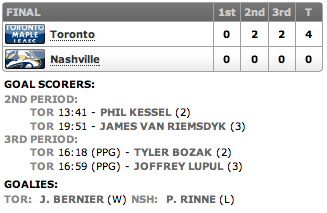 Foi o sétimo shutout da carreira de Bernier e o segundo contra os Predators! Bernier tem sido um dos goleiros mais sólidos da liga nesta temporada e , se continuar assim, garantirá a posição de goleiro número um dos Leafs, vencendo a disputa com James Reimer.