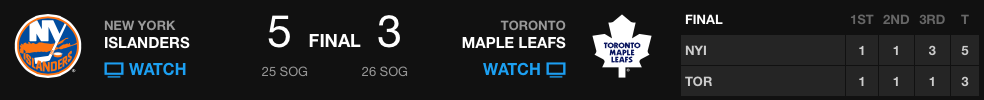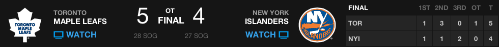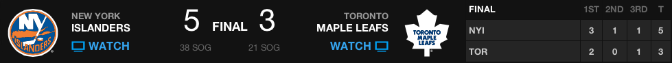 Derrotados pelos Rangers, os Leafs receberiam outro time de New York, os Islanders, que vinham de um jogo na noite anterior, onde venceram os Dallas Stars.