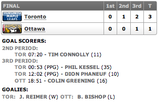 No terceiro período os Leafs já voltaram ao gelo em vantagem numérica, devido a uma penalidade cometida por Zack Smith. Aos 19m45s do segundo período e outra aos 23s do terceiro período, cometida por J. O’Brien. Com 5 contra 3 no gelo, Phil Kessel marcou o segundo dos Leafs aos 53s! Aos 12m02s, Dion Phaneuf chuta forte e também vence Craig Anderson, numa outra vantagem numérica de 5 contra 3, após Daniel Alfredsson cometer slashing e o time dos Senators errarem uma troca de linhas deixando a equipe com mais jogadores no gelo do que o permitido. Com a partida já perdida, os Senators só conseguiram marcar seu gol de honra aos 18m51s, com Corey Greening, mais uma vez evitando um shutout para James Reimer.