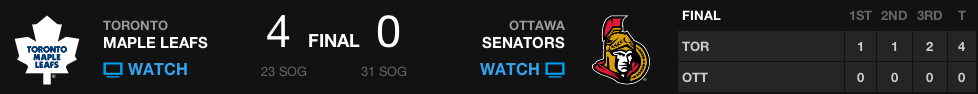 Infelizmente para os Leafs a equipe não jogou bem e sua defesa não conseguiu segurar os Sens. Seus goleiros na partida foram Curtis McElhinney e Garret Sparks, que sofreram juntos 6 gols. Os Leafs somente conseguiram marcar com Auston Matthews e William Nylander, ambos em powerplay. Patrick Marleau, assim como Mitch Marner, não jogou essa partida e os Leafs tiveram chance de ver como alguns jovens talentos se comportavam: Travis Dermott, Timothy Liljgreen, Calle Rosen e Miro Aaltonen, além de Josh Leivo.