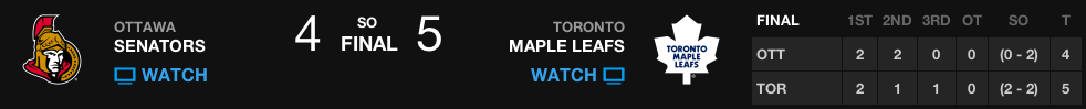 - Maple Leafs beat Senators 5-4 in shootout (nbcsports.com)