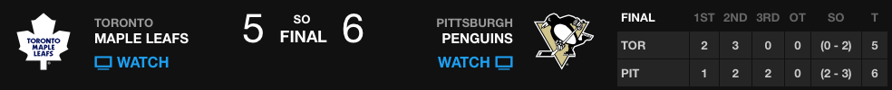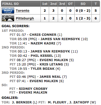 O jogo acabou decidido nos pênaltis e tanto Tyler Bozak, quanto David Clarkson não tiveram sucesso contra o novato Zatkoff. Pelos Penguins, Jussi Jokinen teve seu chute defendido por Bernier, mas Crosby e Malkin, ele de novo, marcaram belos gols, dando a vitória e dois pontos aos Penguins!