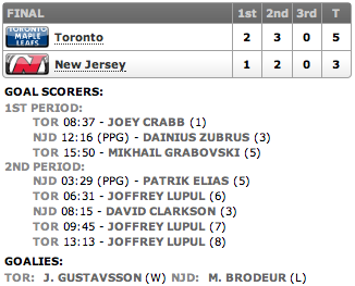 Os Leafs foram ao Prudential Center em New Jersey enfrentar os Devils. Nos gols, Gustavsson, aproveitando a oportunidade com a contusão de James Reimer, e Martin Brodeur, em seu primeiro jogo da temporada, retornando de contusão!