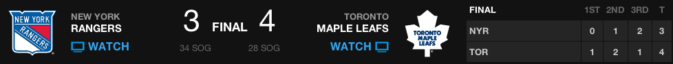 Infelizmente, pelo segundo jogo seguido, os Leafs foram vencidos nas cobranças de penaltis. Jonathan Bernier não conseguiu realizar defesas nos dois primeiros chutes, de Mats Zuccarello e Derek Stepan, enquanto James Van Riemsdyk foi defendido por Cam Talbot e Joffrey Lupul marcou para os Leafs. A decisão foi para a terceira rodada de penaltis, onde Rick Nash foi o primeiro e chutou para fora. Nazem Kadri era o batedor pelos Leafs e, se marcasse, empataria a série, mas acabou defendido por Cam Talbot, que deu a vitória aos Rangers.