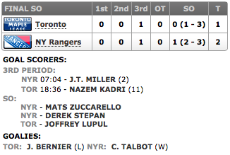 Mais uma vez os Leafs decidiriam uma partida nos penaltis (shootout), mas o retrospecto não era nada favorável. Os Leafs simplesmente perderam todos os 4 jogos que foram ao shootout nesta temporada, segundo o que informava a transmissão, enquanto os Rangers venceram 3 dos 4 shootouts que disputaram. Pelos Leafs chutaram Tyler Bozak, Nazem Kadri e Mikhail Grabovski e pelos Rangers, Rick Nash, Mats Zuccarello e Ryan Callahan. Somente Zuccarello foi feliz em sua cobrança, marcando o gol por debaixo das pernas de Reimer, dando a vitória aos Rangers.