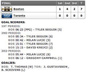 Placar final: Boston Bruins 7 x Toronto Maple Leafs 0.
