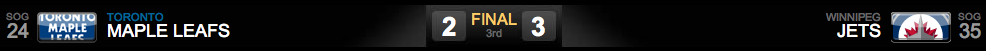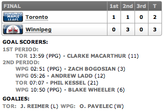 O jogo estava disputado, mas os Leafs saíram na frente com um gol em powerplay de Clarke MacArthur, aos 13m59s. Apesar da liderança dos Leafs, os Jets simplesmente deram quase o dobro de chutes ao gol de Reimer (15 a 8).
