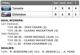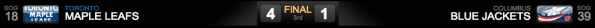O terceiro período ainda viu os Leafs também darem somente 4 chutes ao gol de York, mas Ben Scrivens defendeu todos os 14 chutes dos Blue Jackets, garantindo a vitória dos Leafs.
