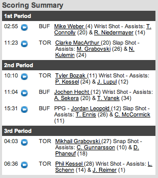 Infelizmente a equipe jogou muito mal e logo no primeiro período e deixou os Sabres abrirem distância no placar, com 2 gols em powerplay. Os Leafs apenas deram 5 chutes à gol, contra 16 dos Sabres. Esse lapso no primeiro período destruiu as chances dos Leafs que, no segundo e terceiro períodos dominaram a partida.