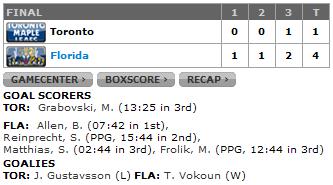 Mais uma vez Phil Kessel não conseguiu marcar nada, nem sequer uma assistência e Jonas Gustavsson não conseguiu parar o ataque dos Panthers, apesar de que não foi falha dele em todos os gols.
