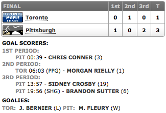 Com o jogo disputado, bastava uma pequena distração de qualquer uma das equipes para que a outra se aproveitasse e passasse à frente no placar. Foi exatamente isso que aconteceu faltando apenas 06m03s para o final do terceiro período. Os Leafs tinham um faceoff em sua zona defensiva, devido à um Icing (quando o puck é lançado desde a zona defensiva até o final da zona de ataque, sem qualquer interferência de outro jogador da equipe. É quase como isolar o puck. Isso é visto como anti-jogo). A linha dos Leafs que estava no gelo teve que ser mantida e Dion Phaneuf, que se mantém colado em Crosby e anulado muitas de suas jogadas, não estava no gelo. Crosby venceu o faceoff e passou para Pascal Dupuis, que passou para Robert Bortuzzo que encontrou Crosby sozinho, desmarcado. Crosby não teve dificuldades para vencer Bernier e colocou o time da casa à frente. Ao finalzinho do período, Brent Sutter ainda marcou um gol com o gol dos Leafs vazio (Empty Net), após vencer uma disputa de puck com Dion Phaneuf, selando a vitória dos Penguins por 3 a 1.