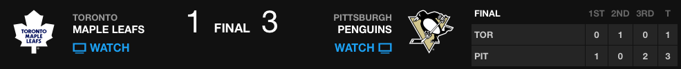 Logo no início do segundo período, Joffrey Lupul diminuiu, marcando o primeiro gol dos Leafs. Evgeny Malkin restaurou os três gols de vantagem para os Penguins e, no terceiro período, Brandon Sutter e Tyler Bozak marcaram gols, que definiram o placar: 5 a 2 para os Penguins.