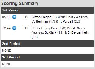 Mal começou o jogo e aos 01m19s, após o puck ser enviado pelas bordas do gelo na zona defensiva dos Leafs, os Flyers o recuperaram na linha azul e Erik Gustafsson chuta forte. O chute ia para fora, mas Simon Gagne estava cruzando em frente ao gol de James Reimer e desviou o puck, de backhand, para o gol dos Leafs, abrindo o placar. Os Leafs se mexeram e aos 03m22s, descontaram. Joffrey Lupul chutou e Ilya Bryzgalov deu rebote, que foi aproveitado por Nikolai Kulemin. Com o jogo empatado as equipes continuavam disputando o puck, mas próximo aos 07m de jogo, Jay Rosehill e Adam Hall fizeram um sanduíche de Joffrey Lupul. Lupul voltou ao banco, mas logo depois deixou a partida e foi aos vestiários. Ele não retornou mais ao jogo e deve ser examinado ainda hoje para verificar se houve alguma contusão mais grave. Sem Lupul os Leafs chegaram a virar a partida com um gol de John-Michael Liles aos 16m46s, num chute da linha a azul, que Bryzgalov não conseguiu ver pois havia muitos jogadores tampando sua visão. Infelizmente, aos 18m35s, os Leafs tomam um gol de empate numa jogada em que Sean Couturier conduz o puck para a zona de ataque dos Flyers e efetua um passe. O passe acaba não sendo cortado pelo jogador dos Leafs que acompanhava Couturier e passando entre as pernas de Carl Gunnarsson, chegando até Jakub Voracek, que marcou o gol de empate com o gol praticamente aberto. Um gol infantil, onde o puck tinha que ser desviado, o passe tinha que ser bloqueado ou Reimer tinha que ter sido mais rápido seguindo o puck! O período termina com as equipes empatadas.
