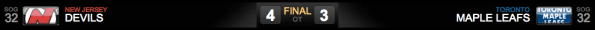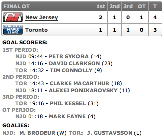Os Leafs acreditavam que, após o empate no último minuto, teriam o momento da partida a seu favor e, após uma boa jogada onde o chute acertou a trave de Martin Brodeur, os Devils partiram ao ataque e, assim como no segundo gol deles, o gol de Clarkson, Mark Fayne efetua um chute à distância e, olhando pela câmera por trás do gol de Gustavsson, tudo nos leva a crer que o puck iria para fora, porém Gustavsson, mesmo sem qualquer pressão de algum jogador dos Devils, acaba se atrapalhando e o puck, mais uma vez, passa por entre suas pernas e é desviado para dentro do gol dos Leafs. Fim de partida, vitória dos Devils.