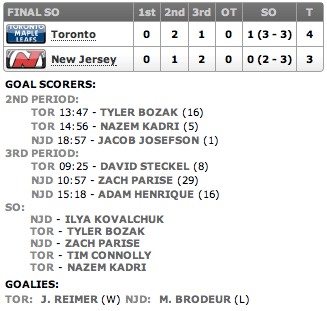 Com a partida sendo decidida nos penaltis (Shootout), e ninguém perdeu suas cobranças: Ilya Kovalchuk, Tyler Bozak, Zach Parise e Tim Connolly, que chutou por debaixo das pernas de Brodeur, exatamente quando este se movimentou para tentar cobrir o canto esquerdo. Foi então a vez do Patrik Elias, que partou para cima de Reimer, chutou e Reimer, sem se mover, acabou defendendo o puck com a perna esquerda. Na verdade Patrik Elias chutou na perna de Reimer, que ficou procurando pelo puck, ou seja, nem viu o que tinha acontecido. A terceira cobrança dos Leafs foi com Nazem Kadri. Kadri usou toda sua habilidade e num movimento muito rápido mudou o puck de um lado para o outro. Frez que ia chutar do lado direito e levou o puck para a esquerda, vencendo o experiente Martin Brodeur. Foi a primeira vez que Brodeur foi vencido por todos os jogadores do time adversário.