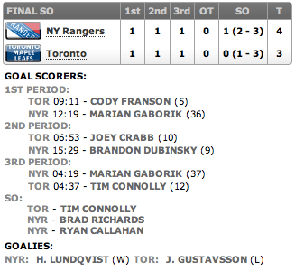 A partida não teve mais alteração de placar e acabou indo para os penaltis (Shootout), como na noite anterior. Dessa vez, Tim Connolly marcou para os Leafs, após Tyler Bozak e Gaborik perderem suas cobranças. Brad Richards empatou. Na terceira cobrança, Nazem Kadri, que assegurou a vitória dos Leafs na noite anterior, acabou chutando por sobre o gol de Lundqvist e Ryan Callahan, capitão dos Rangers, aproveitou a cobrança e venceu para os Rangers.