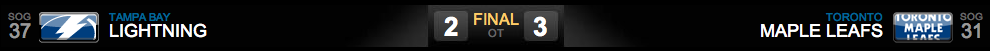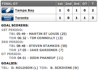 Com o jogo na prorrogação, os Leafs tiveram chances com Jake Gardiner e Phil Kessel, mas Roloson conseguiu defender. Aos 04m01 da prorrogação, os Leafs partem ao ataque com Phaneuf, que passa para Kessel. Kessel chuta mas o puck passa ao lado do gol, volta e encontra Phaneuf sozinho que chutou sem defesa para Roloson, fechando a partida com vitória dos Leafs!