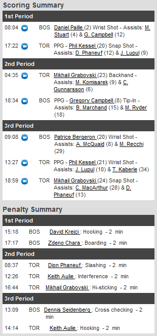 Além de Kessel e Grabovski terem dois gols, Phaneuf e Lupul saíram da partida com duas assistências cada. As linhas especiais dos Leafs também funcionaram bem: o saldo na vantagem numérica foi de 2 gols em 3 chances, e “mataram” 3 das 4 vantagens-numéricas dos Bruins. E Reimer, mais uma vez, fez uma bela partida defendendo 32 dos 35 chutes adversários.