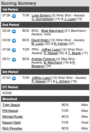 Com dois jogadores dos Bruins (Tyler Seguin e Michael Ryder) e Phil Kessel desperdiçando suas chances, chutando para fora do gol, foi a vez de Nazem Kadri mostrar suas qualidades! Numa jogada muito bonita, onde Kadri “fintou” diversas vezes, ele conseguiu vencer o goleiro dos Bruins! O próximo a tentar marcar seria Rich Peverley, mas James Reimer defendeu!!!