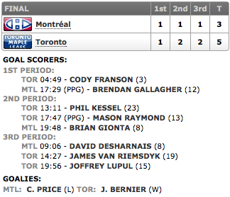 Ahhhhh como é bom vencer! E os Leafs estão num momento bom na temporada, vindos de três vitórias seguidas e enfrentando os Habs, no Air Canada Centre. Os Habs estão à frente dos Leafs na classificação geral e os Leafs necessitavam muito de mais uma vitória para diminuir a distância até eles.