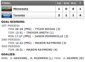 Já no finalzinho da partida, com os WIld buscando um gol para se aproximarem dos Leafs no placar, Kessel rouba o puck e Mason Raymond parte em velocidade, mas aparentemente não toca no puck, deixando o mesmo deslizar para o gol vazio. Na minha visão e opinião, e inclusive na opinião de Joe Bowen, narrador dos Leafs, o gol foi de Kessel, mas a NHL está reportando como gol de Mason Raymond. O importante é que sendo de Raymond ou de Kessel, a vitória é dos Leafs, por 4 a 1.