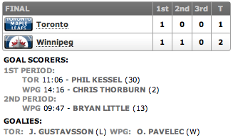 O jogo começou com os Jets pressionando os Leafs e os Leafs tentando usar da sua velocidade para surpreender. Mas quem abre o placar aos 11m06s é Phil Kessel, que marca o seu trigésimo gol da temporada, num contra-ataque matador. O gol joga balde de água fria nos Jets, mas não tanto para tirar eles do jogo. Aos 14m16s Chris Thorburn se aproveita de um contra-ataque e surpreende Gustavsson chutando antes dele se posicionar corretamente para a defesa! Mais tarde, na entrevista após o jogo, Gustavsson afirma que esperava ele cruzar na frente do gol e não chutar daquele ângulo, e estava se posicionando para tal movimento, que não aconteceu!