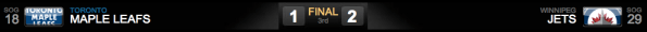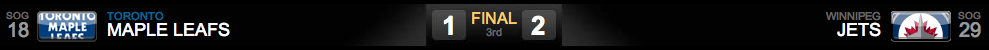 No último período, os Leafs chegaram a pressionar, mas continuavam sem chutar ao gol de Pavelec com perigo. A jogada de maior perigo foi um breakaway de Lombardi, que Pavelec defendeu! Nem mesmo dois powerplays na partida foram aproveitados pelos Leafs, que sequer deram chute ao gol! Também não conseguimos nos valer do uso da Empty Net, com menos de um minuto para o final. Gustavsson foi retirado do gelo para termos mais um atacante, mas os Jets nos mantiveram na zona neutra ou em nossa zona defensiva!