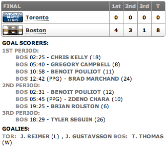 Sem ter muito espaço, na verdade nenhum espaço, para perder, os Leafs necessitam de todas as vitórias possíveis para continuar na briga pela última vaga dos playoffs da conferência leste! Mas os Bruins não tiveram bem que se esforçar muito para vencer os Leafs por um placar totalmente humilhante, algo a não ser esquecido por muito tempo!