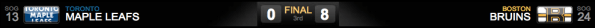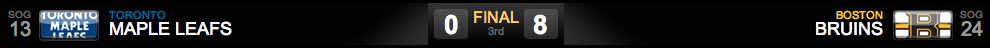 Foi mais uma derrota humilhante e desmoralizante para os Leafs que não apenas não conseguiram vencer os Bruins durante toda a temporada, mas perdeu as seis partidas sem oferecer qualquer dificuldade aos Bruins!